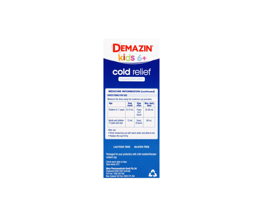 Demazin Kids 6+ Cold Relief Colour Free Syrup 100mL
