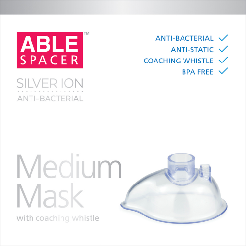 The medium mask with coaching whistle is designed for children. It makes a sound at the correct inhalation rate, providing feedback to the carer when the medication is being inhaled.