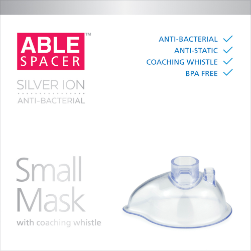 The small mask with coaching whistle is designed for infants. The whistle makes a sound at the correct inhalation rate, providing feedback to the carer when the medication is being inhaled.