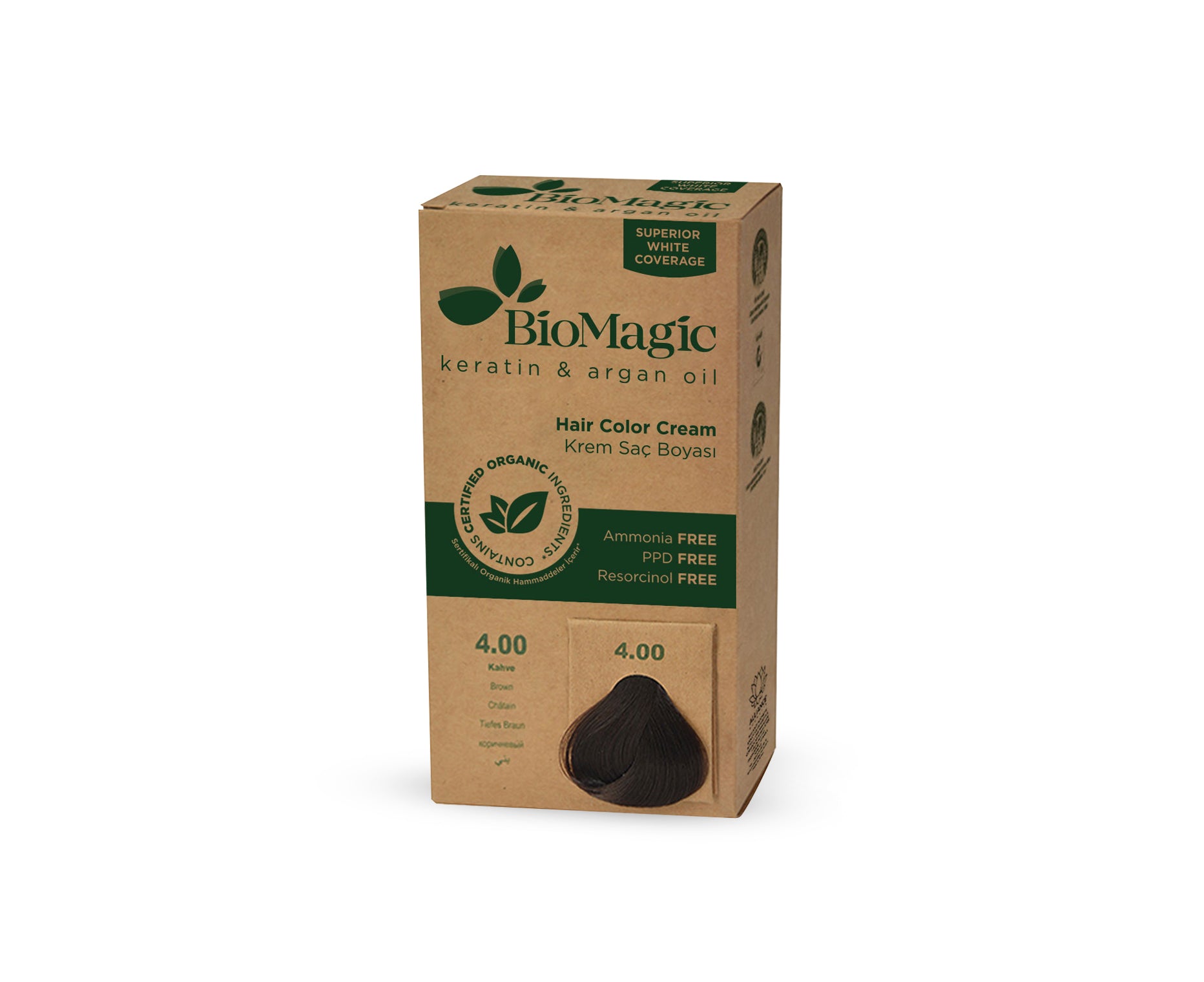 Thanks to its new formula containing Organic Certified Raw Materials, BioMagic Hair Color Cream preserves the naturalness of the hair, and provides the hair with vitality and brightness. The kit has a brown dye that stays on hair for weeks without causing any unnatural side effects. The plant-based compounds used in this hair dye are bioactive which means they penetrate deep into the hair cuticle and nourish your scalp.