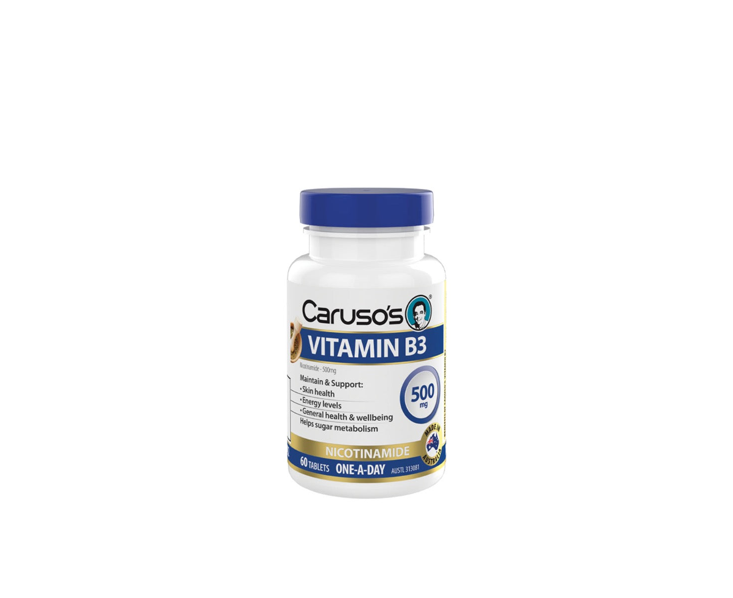 Caruso's Vitamin B3 is a high strength, one-a-day tablet specifically designed for those who require additional Vitamin B3 to help support skin health and maintain energy production through carbohydrate metabolism.