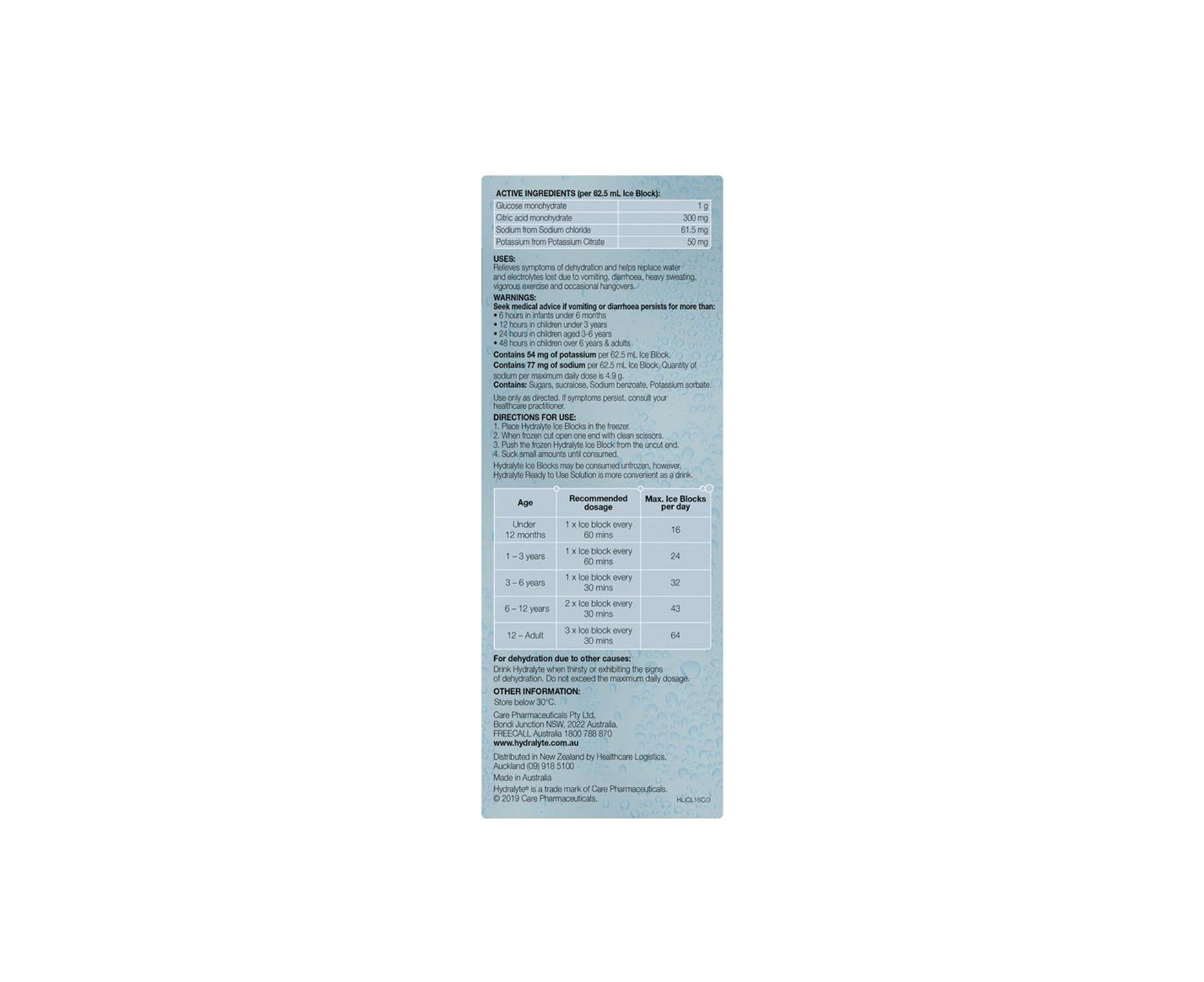 Directions: Place Hydralyte Ice Blocks in the freezer. When frozen cut open one end with clean scissors. Push the frozen Hydralyte Ice Block from the uncut end. Suck small amounts until consumed. Hydralyte Ice Blocks may be consumed unfrozen, however, Hydralyte Ready to Use Solution is more convenient as a drink.