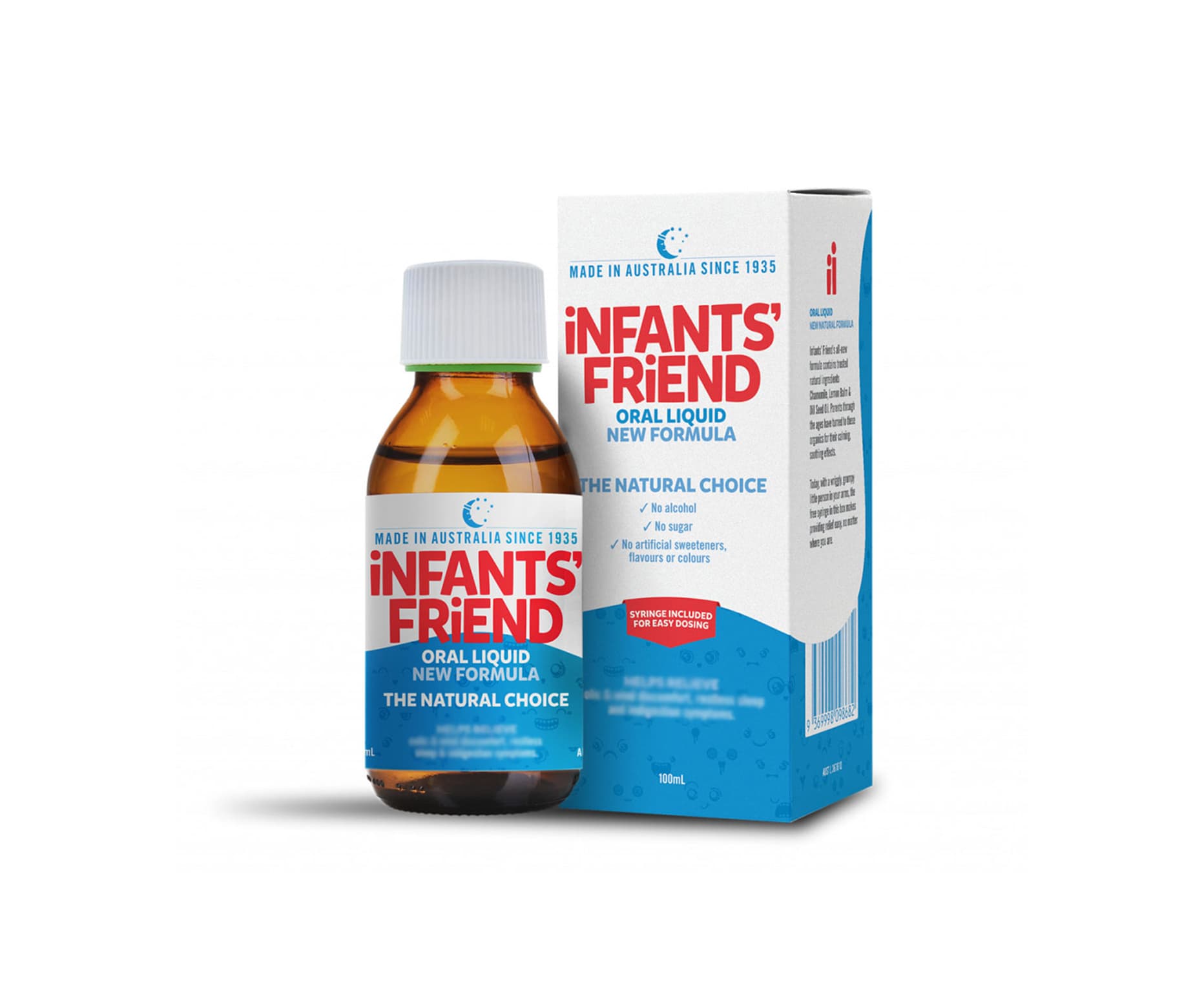 Infants’ Friend’s all-new formula is a pleasant tasting liquid containing trusted natural ingredients Chamomile, Lemon Balm & Dill Seed Oil. Parents through the ages have turned to these organics for their calming, soothing effects. Distributed Australia-wide, Infants’ Friend has been a household name in colic relief for over 85 years. Now with a free syringe included in each box, providing relief for your little one is easier than ever, no matter where you are. Infants’ Friend Oral Liquid is registered in the ARTG (AUST L 367810) with the Therapeutic Goods Administration (TGA), the regulatory agency for pharmaceuticals in Australia.