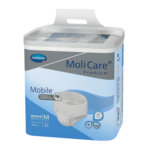 Designed to feel like regular underwear, this new generation of MoliCare® premium Mobile 6 drops adult pull-up pants include optimised leg openings with an anti-leakage barrier, and better bottom coverage for improved wearing comfort.