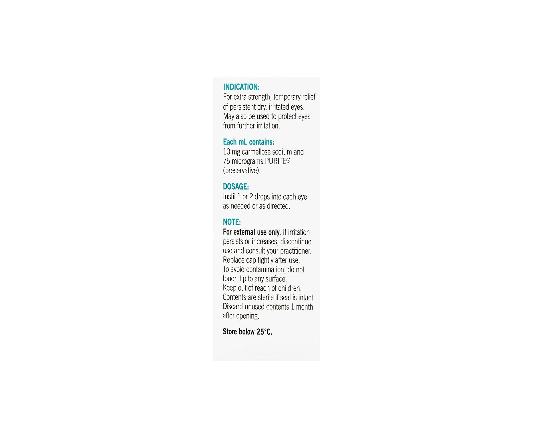 Ingredients: Each mL contains: 10 mg Carmellose Sodium and 75 micrograms PURITE (Preservative).