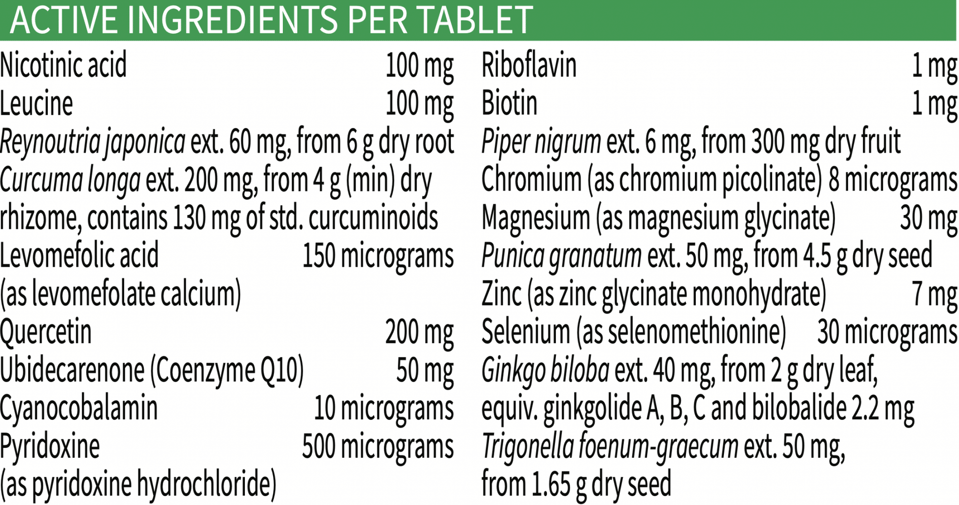 Powered by Nicotinic acid, Nicotinamide, Leucine, Reynoutria japonica extract, Curcuma longa extract, Folic acid, Quercetin, Ubidecarenone (Coenzyme Q10), Cyanocobalamin (Vitamin B12), Pyridoxine hydrochloride (Vitamin B6), Riboflavin (Vitamin B2), Biotin (Vitamin B7), Piper nigrum extract, Chromium, Magnesium, Punica granatum (pomegranate) extract, zinc glycinate monohydrate, selenomethionine, Ginkgo biloba extract and Trigonella foenum-graecum (fenugreek) extract.