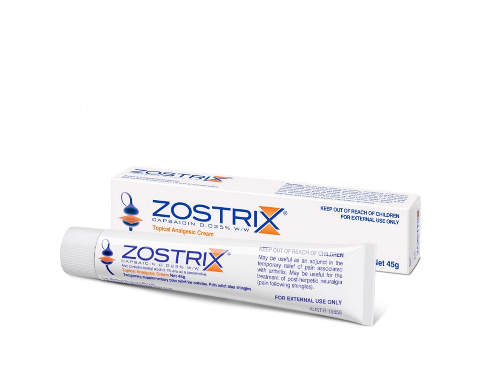 Zostrix Capsaicin 0.025%. May be useful as an adjunct in the temporary relief of pain associated with arthritis. May be useful for the treatment of post-herpetic neuralgia (pain following shingles).
